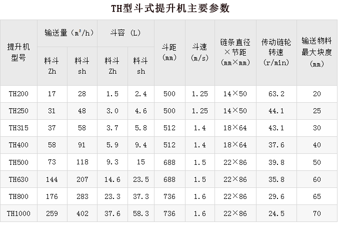 TH型斗式提升機允許料斗的運行速度一般在0.8~2m/s,輸送量一般在16~47.2m3/h,輸送機高度一般在4.5~30米之間。