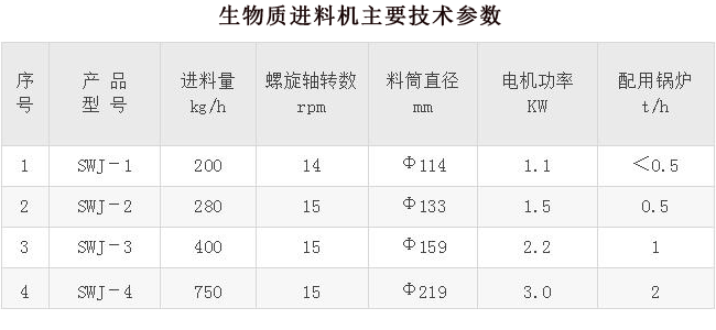 SWJ型系列生物質進料機,是我公司專為生物質鍋爐燃用秸桿顆粒等物料配套的理想進料設備,可大幅減輕進料勞動強度,保護環境衛生,保證安全生產。該機操作簡便,每班僅需一人間斷地往料箱內加滿生物質顆粒和做一般性檢查巡視,就能使鍋爐進料與爐膛燃燒正常進行。該機適用于立式或臥式生物質鍋爐2噸以下單臺鍋爐的進料系統。
