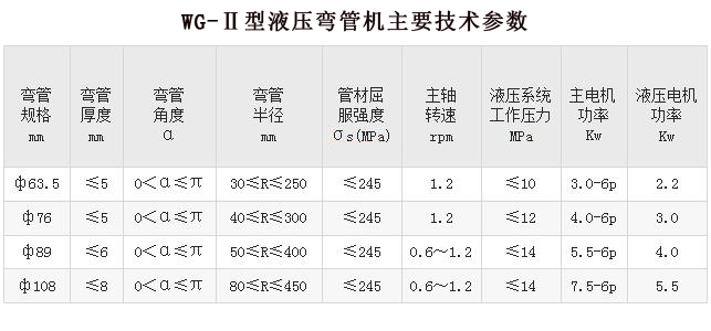 WG-Ⅱ型彎管機是我公司自行研制的具有彎制不大于180度的各種角度管件的專用彎管設備。本機為冷彎式液壓彎管機,不用芯棒與加熱灌沙等工藝,適用于在冷態(tài)條件下彎曲輸送流體用無縫管和一般用途鋼管,可廣泛使用于鍋爐、化工、石油、暖通、金屬結構及機械制造行業(yè)等領域。